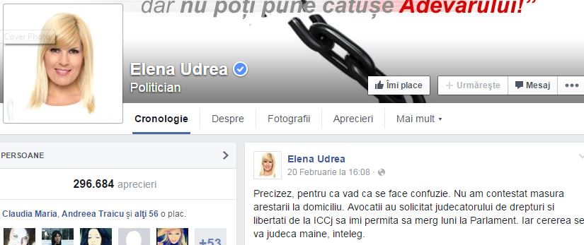 “Precizez, pentru ca vad ca se face confuzie. Nu am contestat masura arestarii la domiciliu. Avocatii au solicitat judecatorului de drepturi si libertati de la ICCj sa imi permita sa merg luni la Parlament. Iar cererea se va judeca maine, inteleg”, a scris Elena Udrea pe Facebook.