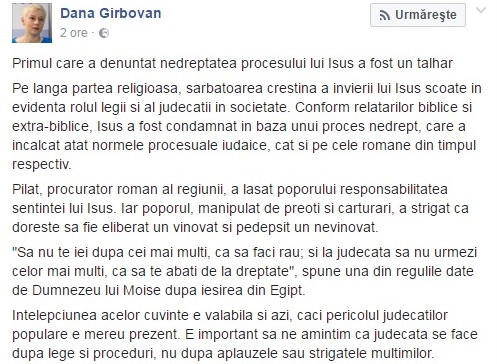 Judecătoarea Dana Gîrbovan a postat pe Facebook în această seară un mesaj deosebit, cu ocazia sărbătorilor pascale. „Primul care a denuntat nedreptatea procesului lui Isus a fost un talhar