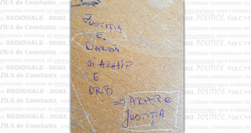 Justiția e oarbă, ne spune o zicală celebră. Adică e imparțială, nu face deosebiri între tineri și bătrâni, între săraci și bogați. Nu trebuie să vadă nici prieteni, nici duşmani. Să fie oarbă sau, altfel spus, protejată de „strălucirea” uneia sau alteia dintre părţi. Redactorii ZIUA de Constanţa au intrat în posesia unei imagini ce conţine un mesaj scris pe masa unei săli din Judecătoria Constanţa. Un mesaj despre justiţie.