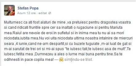 „Mulţumesc pentru că aţi fost alături de mine, vă preţuiesc pentru dragostea voastră şi când ridicaţi frunţile spre cer, să înălţaţi o rugăciune şi pentru Mariuţa mea. Raiul are nevoie de eroi. În sufletul şi în inima mea tu nu ai să mori niciodată, iubita mea! Nu voi uita niciodată ultima noastră întâlnire de miercuri seara ,4 iunie, când ne-am despărţit şi cu buzele ţuguiate, m-ai luat de gat şi m-ai sărutat de trei ori şi mi-ai spus «te iubesc tati, te iubesc aşa de mult!» Te iubesc, fetiţa mea! Dumnezeu a ales o lume mai bună pentru tine. Să te odihneşti în pace, copila mea! — simţindu-se trist“, au fost cuvintele tatălui micuţei postat în urmă cu câteva ore pe Facebook.