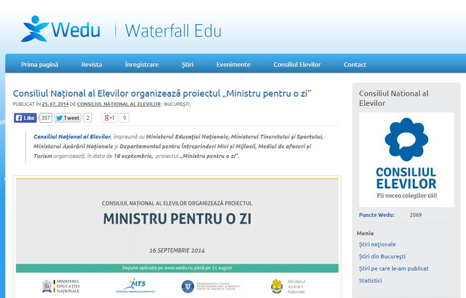 Scopul evenimentului “ministru pentru o zi” este de a înlătura barierele de comunicare dintre elevi şi mediul decizional şi conştientizarea responsabilităţilor unui lider cu atribuţii la nivel naţional. Proiectul se realizează în parteneriat cu Consiliul Naţional al Elevilor, for consultativ în cadrul sistemului educaţional.