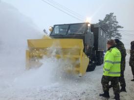Coloana este deschisă de către un utilaj de deszăpezire, însă condițiile meteo nefavorabile îngreunează deplasarea.