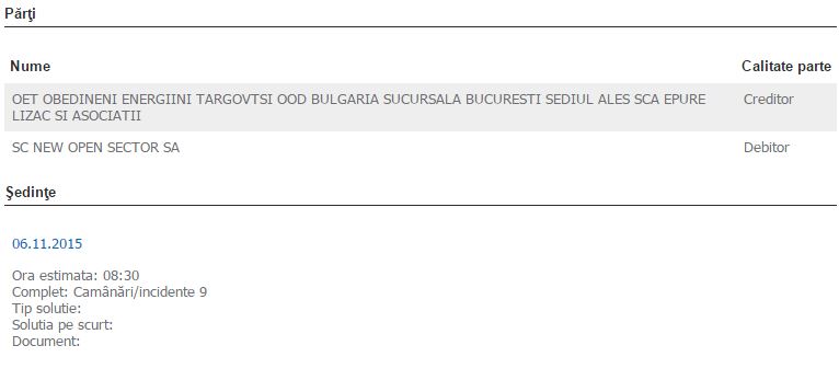 Pe rolul Judecătoriei Constanţa, OET Obedineni Energiini Targovtsi OOD Bulgaria Sucursala Bucureşti cu sediul procesual ales la SCA Epure Lizac şi Asociaţii a deschis o acţiune civilă împotriva New Open Sector SA pentru o ordonanţă de plată.