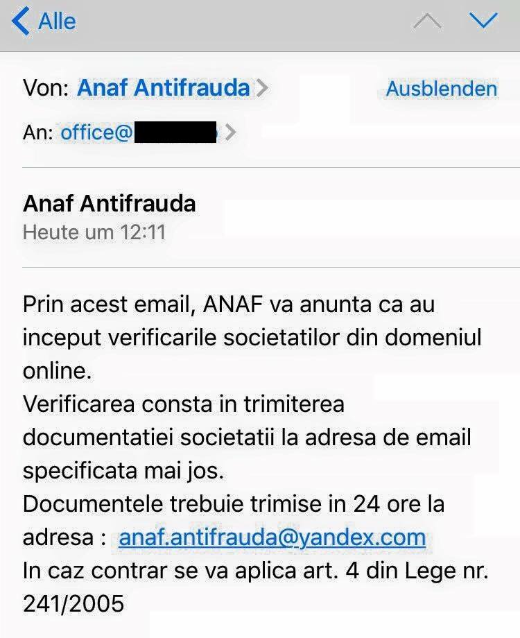 Direcţia Generală Antifraudă Fiscală avertizează asupra unei tentative frauduloase de colectare a unor date confidenţiale (phishing). În acest sens, recomandă tuturor reprezentanţilor operatorilor economici să ignore orice solicitare de date confidenţiale primită de la adrese de email cu origine îndoielnică, precum cele anexate în galeria foto.