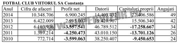 Revenind la VIITORUL, merită remarcat faptul că societatea nu figurează în evidenţele ANAF cu obligaţii restante la bugetele de stat (la 31 martie 2015) şi nici informaţii/zvonuri despre datorii către jucători nu au apărut în spaţiul public.