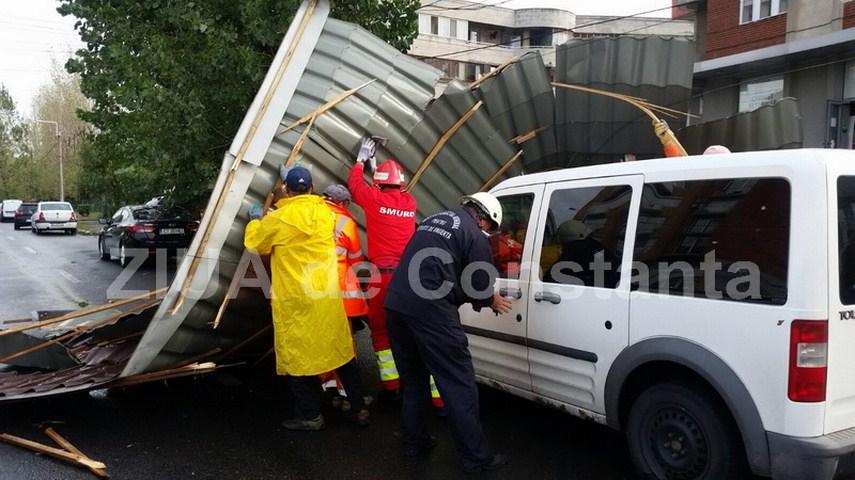 Mai grea misiune au avut pompierii de la ISU Dobrogea, care au fost nevoiți să se lupte cu o bucată uriașă de tablă desprinsă de pe un acoperiș și care a distrus o mașină parcată în zona Billa.