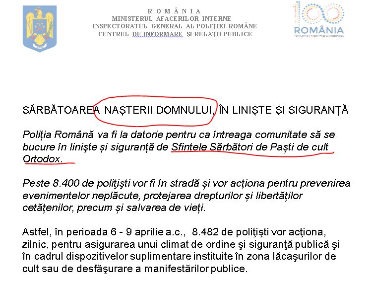 Însă în comunicatul de presă se precizează că „Sărbătoarea nașterii Domnului va fi în liniște și siguranță“