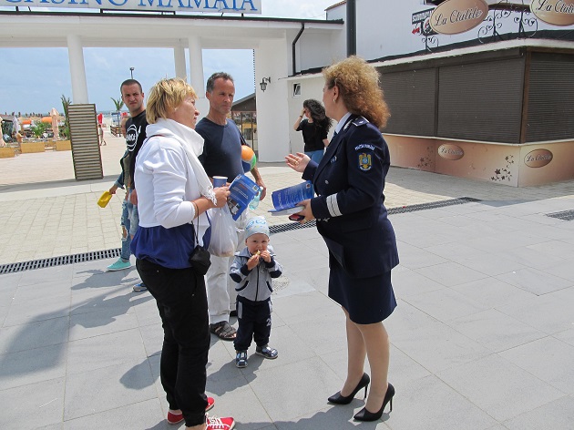 În acest sens, poliţiştii Compartimentului de Analiză şi Prevenire a Criminalităţii din cadrul Inspectoratului Județean de Poliție Constanţa au defăşurat o activitate de informare a turiştilor aflaţi pe litoral, în zona Cazino Mamaia, cu privire la modalităţile de prevenire a infracţiunilor specifice sezonului estival.