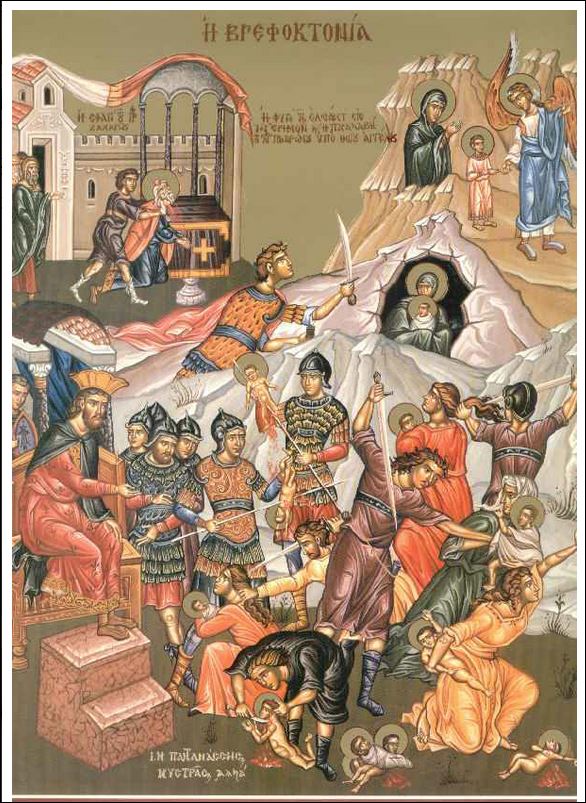 Văzând că a fost înșelat de magi, Irod s-a mâniat și a poruncit uciderea tuturor pruncilor de parte bărbătească, din tot Betleemul Iudeii și din împrejurimi, gândind că astfel va ucide pe noul împărat.