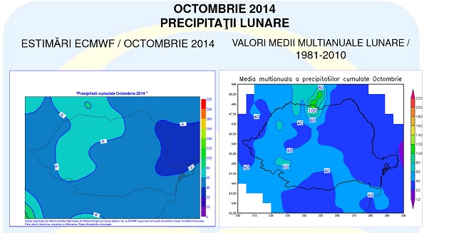 În octombrie, valorile termice vor fi peste mediile climatologice in sud-est si local in regiunile sudice si vestice, iar in restul teritoriului vor fi apropiate de normalul perioadei. Cât privește cantitatile lunare de precipitatii, acestea vor avea în luna octombrie o tendinta de excedent in cea mai mare parte a tarii.