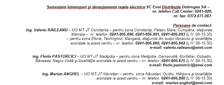 Pentru lucrările anuale de reparaţii şi întreţinere instalaţii şi reţele electrice, precum şi posturi de transformare, SC Enel Distribuţie Dobrogea SA - Zona MT-JT Constanţa, anunţă întreruperea furnizării energiei electrice în timpul lucrărilor, după următorul program: