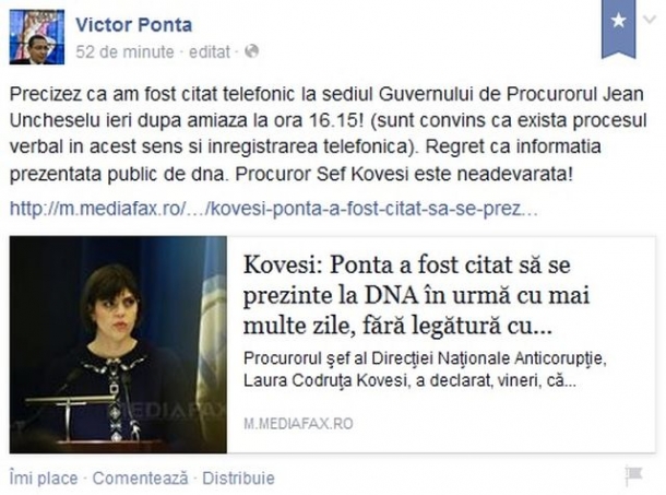 ”Precizez că am fost citat telefonic la sediul Guvernului de Procurorul Jean Uncheșelu ieri după amiază la ora 16.15! (sunt convins că există procesul verbal în acest sens și înregistrarea telefonică). Regret că informația prezentată public de dna. Procuror Șef Kovesi este neadevărată!”, este mesajul postat de premier pe rețeaua de socializare.