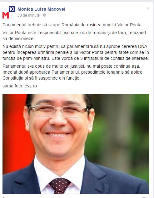 “Parlamentul trebuie să scape România de rușinea numită Victor Ponta. Victor Ponta este iresponsabil, își bate joc de români și de țară, refuzând să demisioneze. Nu există niciun motiv pentru ca parlamentarii să nu aprobe cererea DNA pentru începerea urmăririi penale a lui Victor Ponta pentru fapte comise în funcția de prim-ministru. Este vorba de 3 infracțiuni de conflict de interese. Parlamentul s-a opus de multe ori justiției, nu mai poate continua așa. Imediat după aprobarea Parlamentului, președintele Iohannis să aplice Constituția și să îl suspende din funcție”, spune Monica Macovei.