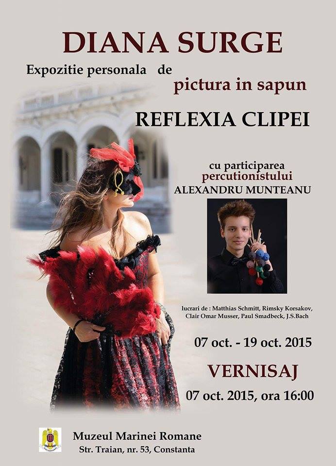 Miercuri, 7 octombrie, începând cu ora 16.00, în Salonul Expozițional „Clio” al Muzeului Marinei Române va avea loc vernisajul expoziției: „Reflexia clipei”. Ineditul evenimentului constă în faptul că Diana Surge este singurul artist cunoscut la nivel mondial care realizează pictură în săpun.