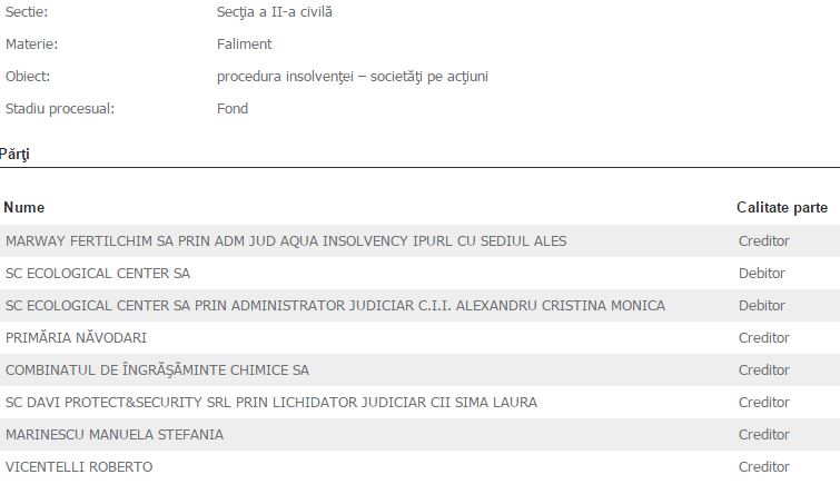 La acest proces participă în calitate de debitor SC Ecological Center SA, prin administratorul judiciar Alexandru Cristina Monica, iar creditori sunt Marway Fertilchim SA prin administrator judiciar Aqua Insolvency IPURL, Primăria Năvodari, Combinatul De Îngrăşăminte Chimice SA, SC Davi Protect&Security SRL, prin Lichidator Judiciar CII Sima Laura, Marinescu Manuela Ștefania și Vicentelli Roberto.