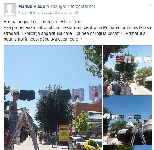 Patronul unui restaurant din Eforie Nord a găsit o metodă hilară de a protesta după ce i-a fost închisă terasa. Omul a agăţat, la intrarea pe terasa sa, pe trotuar, mai multe perechi de chiloţi murdari.Marius Vlădo, cel care a publicat fotografiile pe Facebook, scrie pe Facebook că angajații terasei au spun că semnificația gestului este o formă de protest după ce primarul a închis terasa stradală, deși în trecut a băut acolo ”până a făcut pe el”.