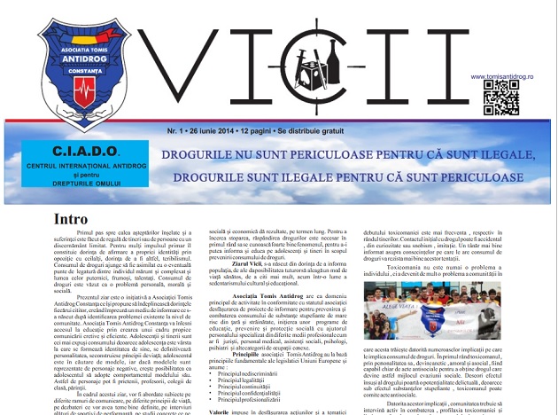 În cadrul Universitatii „Ovidius” Constanta, la Sala de Consiliu, ieri, cu ocazia Zilei Internationale Antidrog, a avut loc lansarea ziarului Vicii, unicul ziar pe teme de prevenire și combatere a substanțelor stupefiante din România, initiativa aparținând Asociației Tomis Antidrog Constanta în colaborare cu C.I.A.D.O.(Centrul International Antidrog si pentru Drepturile Omului).„A fost un eveniment unic ce a scos in evidenta importanta tiparirii acestui ziar, deoarece acest produs este bine venit in randul comunitatii locale, fiind un reper pentru educatie, pentru sanatate ce isi propune prin articolele publicate de la numar la numar, sa dezvolte la tineri obiceiuri sanatoase, pe care ei sa le aprecieze si ulterior drept aspecte de baza ale calitatii vietii, invatandu-i totodata sa respinga modelele de comportament care nu conduc la starea de bine fizic si spiritual corespunzătoare starii de sanatate”, se arată pe tomisantidrog.ro.