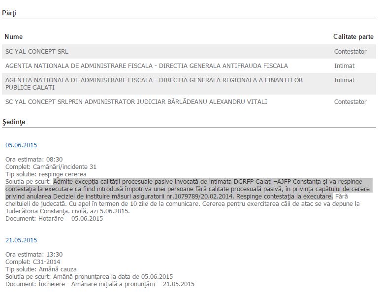 “Admite excepţia calităţii procesuale pasive invocată de intimata DGRFP Galaţi –AJFP Constanţa şi va respinge contestaţia la executare ca fiind introdusă împotriva unei persoane fără calitate procesuală pasivă, în privinţa capătului de cerere privind anularea Deciziei de instituire măsuri asiguratorii nr.1079789/20.02.2014. Respinge contestaţia la executare”, se arată în minuta instanţei.