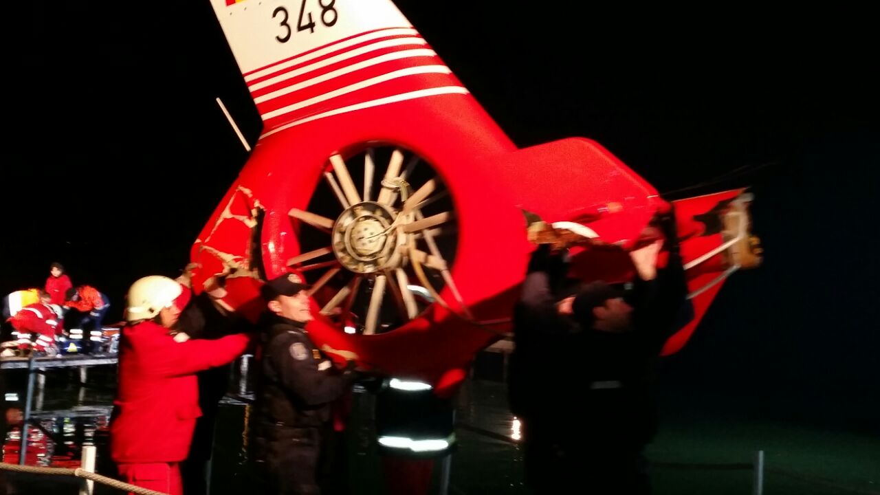 La aceasta oră, scafandrii încă mai scot bucăți din epava elicopterului.