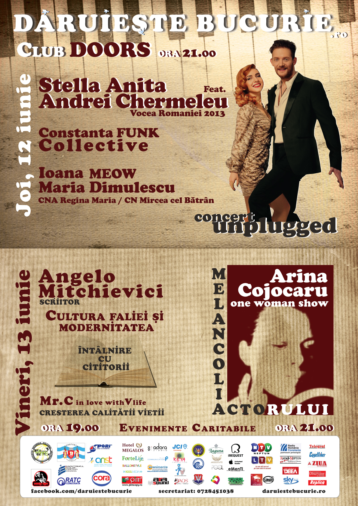 Asociaţia Naţionala Cultural - Artistică „Total Dance Center” continuă campania naţională umanitară „Dăruieşte bucurie”, prin organizarea evenimentelor caritabile „1 DOOR, 2 KEYS, 3 ARTS”, în zilele de joi şi vineri (12-13 iunie 2014).Joi, 12 iunie 2014, începând cu ora 21.00, Club Doors va fi gazda concertului susţinut de soliştii Stella Anita şi Andrei Chermeleu (Vocea României 2013), Constanţa Funk Collective, respectiv artiştii Ioana Meow (elevă a Colegiului Naţional de Arte „Regina Maria”) şi Maria Dimulescu (Colegiul Naţional „Mircea cel Bătrân”).