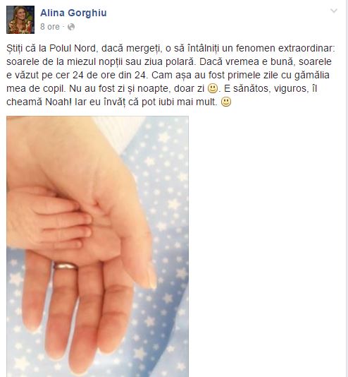 ”Știți că la Polul Nord, dacă mergeți, o să întâlniți un fenomen extraordinar: soarele de la miezul nopții sau ziua polară. Dacă vremea e bună, soarele e văzut pe cer 24 de ore din 24. Cam așa au fost primele zile cu gămălia mea de copil. Nu au fost zi și noapte, doar zi. E sănătos, viguros, îl cheamă Noah! Iar eu învăț că pot iubi mai mult”, e primul mesaj al Alinei Gorghiu.