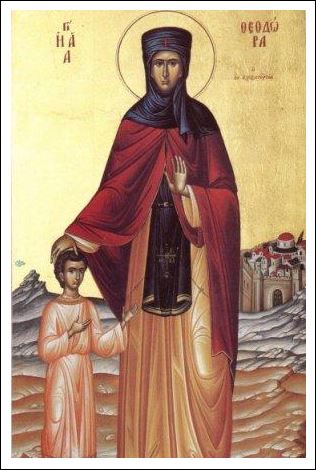 Taindu-si parul si imbracand haine barbatesti s-a inchinoviat in manastirea Octodecatos, luandu-si numele de Teodor. A uimit obstea de monahi cu nevointele, cu postul si lacrimile de pocainta. O tanara de o moralitate indoielnica a acuzat, pe nedrept pe "Teodor" ca a lasat-o insarcinata.