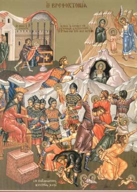 Crima aceasta fara seaman s-a petrecut la un an dupa Nasterea Mantuitorului, cand Irod cauta Pruncul ca o fiara salbatica, ca sa il ucida. Prin voia lui Dumnezeu, familia sfanta si Pruncul Iisus s-au refugiat in Egipt si astfel a scapat de mania imparatului.
