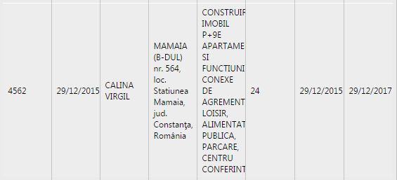 Primăria Municipiului Constanța a eliberat ieri, certificatul de urbanism numărul 4562, la solicitarea lui Virgil Călina, pentru adresa Municipiul Constanța-Stațiunea Mamaia, bulevardul Mamaia numărul 564.