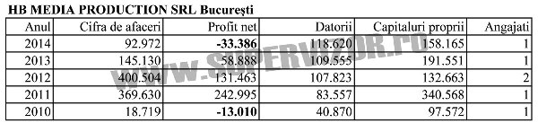 La finalul anului, această societate înregistra creanţe de 240.379 lei, sumă care depăşeşte cifra de afaceri cumulată a anilor 2013 şi 2014, situaţie care sugerează că cel puţin o parte din aceşti bani nu vor mai fi recuperaţi vreodată. Tot la 31 decembrie 2014, datoriile HB MEDIA PRODUCTION SRL totalizau 118.620 lei, iar suma din casă şi conturi era de 32.007 lei.