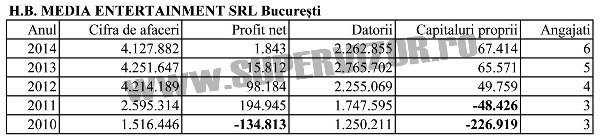 H.B. MEDIA ENTERTAINMENT SRL Bucureşti (CUI: 16630533) încă nu a ajuns pe pierdere, dar profitul net a scăzut în ultimii ani, ajungând la numai 1.843 lei în 2014, faţă de 194.945 lei în 2011. Cifra de afaceri s-a menţinut relativ constantă în ultimii 3 ani, o creştere importantă fiind înregistrată în anul electoral 2012.