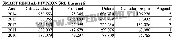 După o cădere severă în 2013, an pentru care a raportat pierderi, SMART RENTAL DIVISION SRL şi-a revenit în 2014, când a înregistrat un profit de 28.346 lei, la o cifră de afaceri de 937.553 lei. La sfârşitul anului, datoriile se ridicau la 696.430 lei, în timp ce creanţele (272.348 lei) nu depăşeau foarte mult suma din casă şi conturi (201.416 lei). Oficial, firma prestează “activităţi de închiriere şi leasing cu alte maşini, echipamente şi bunuri tangibile”. Practic, oferă servicii şi echipamente pentru concerte şsi evenimente indoor şi outdoor (sonorizări, videoproiecţii, lumini, DJ).