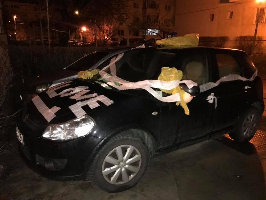 Un șofer din Constanța a avut neplăcuta surpriză să își găsească mașina în această dimineață în parcare acoperită cu hârtie igienică și gunoaie. În plus, ”decoratorul” de ocazie i-a lăsat un mesaj pe capotă scris cu hârtie igienică. Acesta a scris ”Love” cu hârtie igienică.