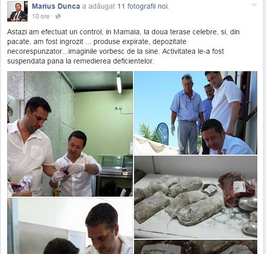 Președintele Autorității Naționale pentru Protecția Consumatorilor (ANPC), Marius Alexandru Dunca, s-a întors din nou în stațiunea Mamaia. El s-a dus punct ochit, punct lovit la terasele de fițe, Potrivit unor surse, este vorba despre LeGaga și Loft. Prima aparține celebrului designer Cătălin Botezatu. Aici, șeful ANPC a descoperit că deși era un local cu pretenții avea pregătit pentru turiști niște mușchi de vită EXPIRAT şi nişte şi fructe de mare cu termen de garanţie depăşit. ”Am fost îngrozit. Am găsit produse expirate, care sunt depozitate necorespunzator. Imaginile vorbesc de la sine. Activitatea le-a fost suspendată până la remedierea deficiențelor”, a declarat Marius Dunca. Aproape 60 de kilograme de mozarella erau congelate. În faţa inspectorilor OPC, angajaţii restaurantului au încercat să găsească tot felul de scuze. Cele peste 80 de kilograme de alimente descoperite în condiţii improprii au fost distruse de inspectori. Patronul localului s-a ales cu amenda maximă de 20.000 de lei. Oamenii au comentat pe Facebook reacționat în urma imaginilor postate de șeful ANPC: ”Respect!!!!!! Mulțumim că aveți grijă de noi!!!”, ”Felicitări! Spor la muncă în continuare:)”, ”Au îmbolnăvit cetățenii cu bună știință pentru a-și vinde marfa expirată, trebuiau amendați”, ” Respect dl. Dunca pentru faptul că apăraţi sănătatea consumatorului. Mult succes în activitatea viitoare inclusiv în sectorul serviciilor financiar-bancare!”, ” Se joacă cu sănătatea oamenilor! Rușine!”, Ce nesimtiti! Să sperăm că se vor remedia pentru tot sezonul, nu pentru 2-3 zile! Știam că banu' este ochiul dracului, dar nici sa te joci cu sănătatea omului”.