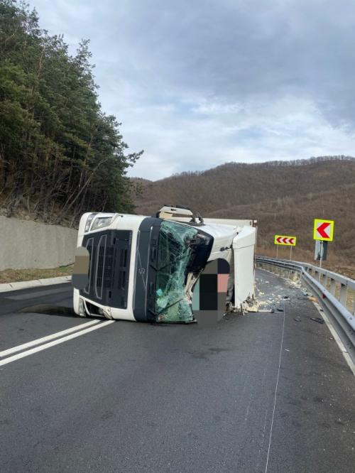 TIR- ul este încărcat, iar șoseaua este mai înaltă decât calea ferată cu 2m.