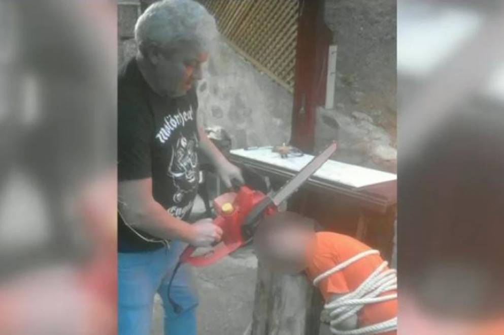 Fotografia, devenită viral pe reţelele de socializare, a fost făcută chiar de către prietenii consilierului liberal şi îl ilustrează pe acesta ţinând în mână o drujbă, prin care încearcă să arate cum i-ar putea tăia capul unui alt prieten, legat de un beştean.