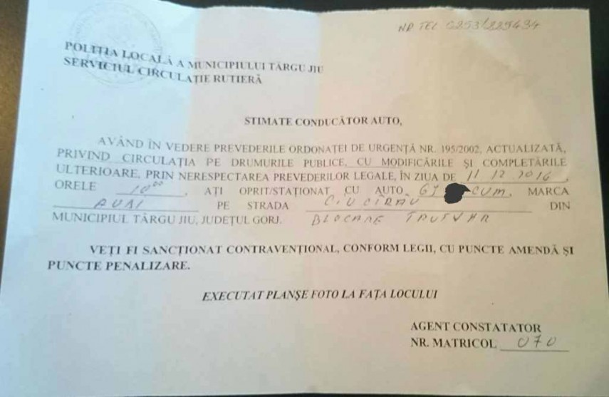 Pe pagina de Facebook „Poliţiştii au umor“ a fost postat documentul oficial prin care un conducător auto este înştiinţat de Serviciul Circulaţie Rutieră că va sancţionat contravenţional, cu puncte amendă şi puncte penalizare, pentru, aşa cum a scris agentul constatator, „blocare trutvar“, pe o stradă din municipiul Tg. Jiu. Sursa foto: Facebook (Poliţiştii au umor)