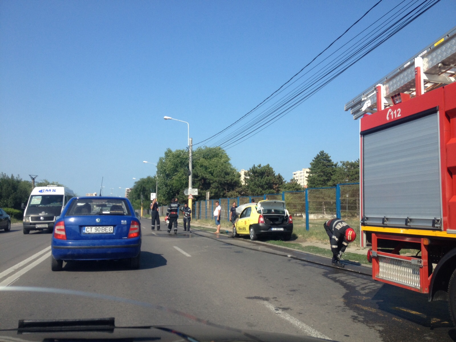 Un autoturism taxi a luat foc pe varianta ocolitoare a municipiului Constanţa. Şoferul a tras pe dreapta când a observat că de sub capotă iese fum.