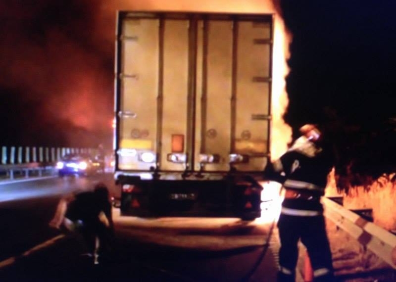 Pompierii au ajuns imediat la faţa locului şi au reuşit să stingă focul care a pornit de la roata dublă a remorcii care s-a blocat şi prin frecare a luat foc.