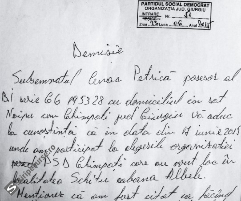 Unul dintre proaspeţii aleşi vicepreședinte PSD Ghimpaţi, Petrică Cenac, și-a scris demisia. Că omul şi-a dat demisia ar fi cum ar fi, dar interesant este că Petrică Cenac scrie în această demisie, negru pe alb: „nu am avut cunoştinţă ca eu să fiu ales vicepreşedinte PSD!”, explicând, în felul său, şi cum a ajuns în această poziţie: “am fost citat ca făcând parte din biroul nou înfiinţat politic cu funcţia de vicepreşedinte unde nu mi s-a părut ca fiind alegeri (…)”. Şi mai interesantă este, însă, continuarea: „eu am fost anunţat de numitul Bădilă Ştefan pe care îl cunoşteam ca membru PNL, unde sunt membru, iar apartenenţa mea politică este PNL, unde sunt membru….”.