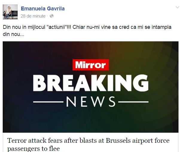 Printre românii care se află la Bruxelles în aceste momente este şi constănţeanca Emanuela Gavrilă. Fosta iubită a senatorului Alexandru Mazăre, candidată la Primăria Costineşti şi ex-şefa Organizaţiei Locale a PSD Costineşti, Ema Gavrilă a postat pe pagina sa de pe o reţea de socializare că este „din nou în mijlocul «acţiunii»“. „Din nou in mijlocul "acţiunii"!!! Chiar nu-mi vine să cred că mi se întâmplă din nou...“, „Explozie şi la metrou! Bruxelles sub asediu! Sper să ajung să vă revăd!“, a mai notat aceasta în urmă cu puţin timp.