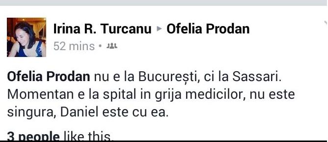 „Cine o cunoaşte pe Ofelia Prodan? Sunaţi-o careva, mergeţi la ea. Căutaţi-o! Vă rog. Am înţeles că este în Italia. Cine o cunoaşte personal? Cine are numărul ei de telefon? Sper că n-a făcut ce zicea că face. Hei, trezirea!