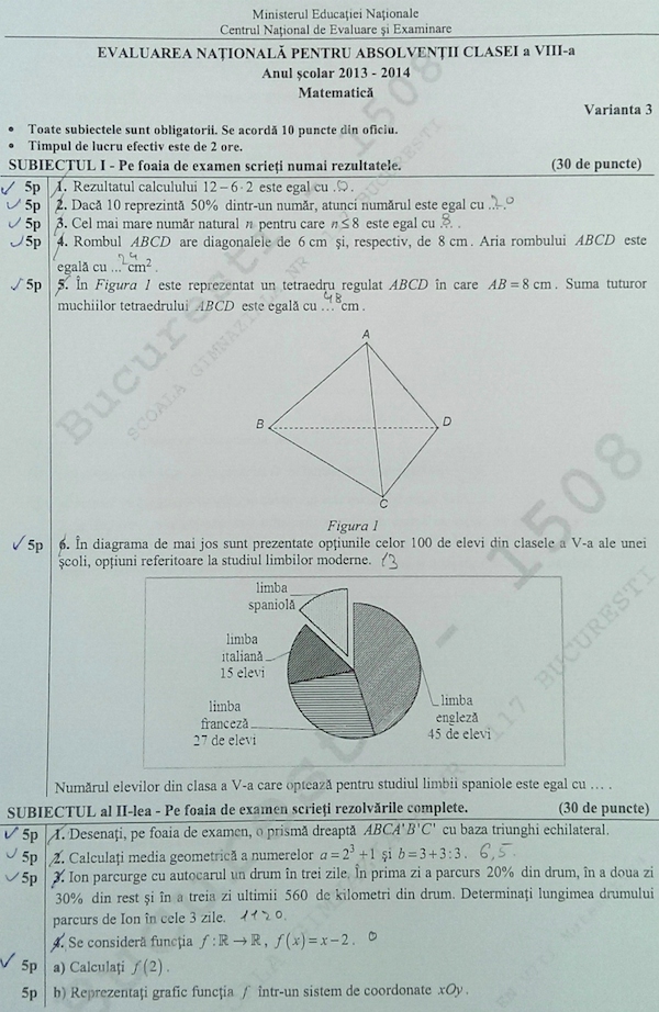 UPDATE. Evaluare naţională 2014 Subiectele la Matematică (foto)