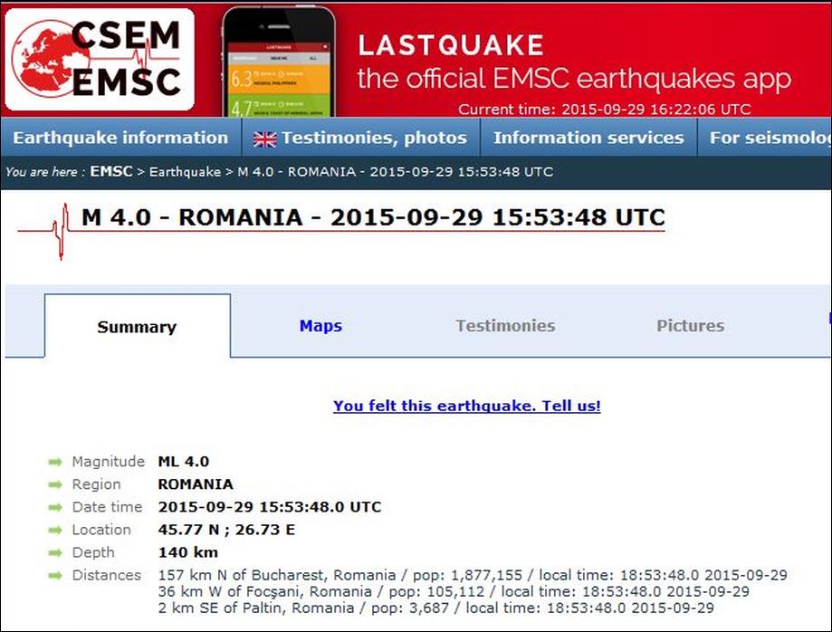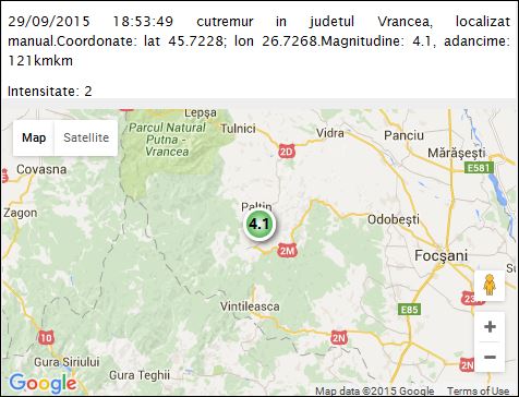 Epicentrul a fost localizat la interferenţa coordonatelor geografice lat 45.77/lon 26.72.