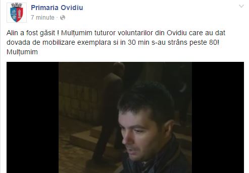 Pe pagina de Facebook a Primăriei din Ovidiu scrie că Alin a fost găsit.
