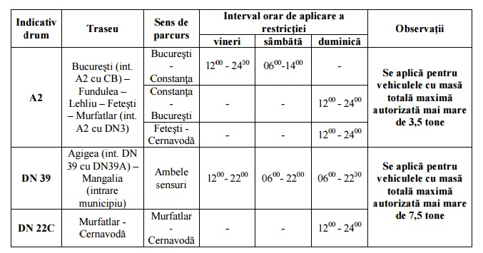 Anunţul a fost făcut de reprezentanţii Companiei Naţionale de Autostrăzi şi Drumuri Naţionale din România, restricţiile fiind valabile pentru zilele de vineri, sâmbătă şi duminică din intervalul menţionat.