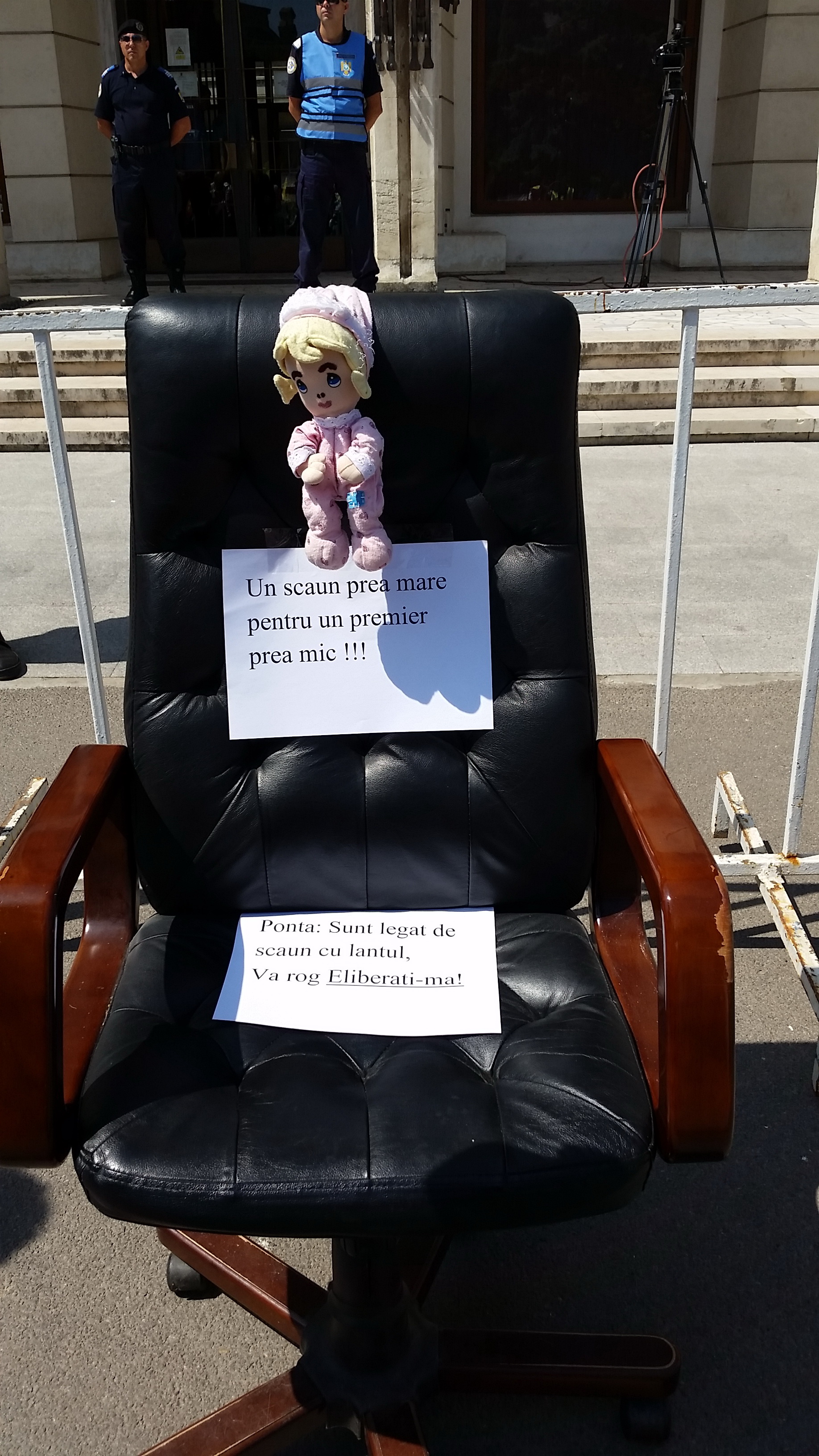 În aceste momente, în faţa Prefecturii Constanţa se desfăşoară un protest organizat de liberali. Aproximativ 300 de persoane s-au adunat în faţa instituţiei prefectului şi rândurile se îngroaşă constant. Protestatarii au adus cu ei, în mod simbolic, un scaun pe care este agăţată o păpuşă şi sunt puse două afişe pe care scrie: “Un scaun prea mare pentru un premier prea mic!!!”, “Ponta: Sunt legat de scaun cu lanţul, vă rog eliberaţi-mă!”De asemenea, oamenii mai au un banner pe care scrie “Nu vreau să fiu reprezentat de un premier penal”, “Ponta nu uita a venit şi vremea ta”. Ei aveau cartoane pe care scria “Victoraş esti un laş!”, “Facem dreptate din străinătate”, “Plagiator, ţi-e frică de popor!”, “Votul l-ai blocat, noi te-am amendat!”.