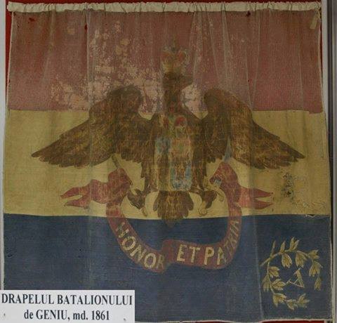 Aceste steaguri din 1863 cuprindeau tricolorul dispus pe orizontală, roşu fiind plasat în partea superioară. În centrul lor era gravată stema unită – acvila cruciată şi capul de bour, compoziţie menită a atesta noul statut politic al ţărilor române. Cele două steme reunite pe acelaşi steag erau înconjurate de o eşarfă ce avea înscrisă deviza “HONOR ET PATRIA”. Pe steag era ţesută şi iniţiala domnitorului.