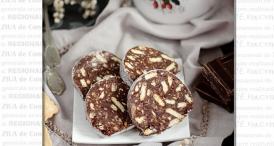 3. Întinde o folie alimentară în strat dublu pe o suprafață curată, pe care ai șters-o în prealabil cu o cârpă umedă (astfel folia se va lipi mai bine). Cu ajutorul unei linguri, transferă compoziția pe partea centrală a foliei – trebuie să creezi o formă de salam cu o lungime de aproximativ 30cm. Învelește-l cu folia alimentară, apăsându-l de suprafața de lucru pentru ca folia să se lipească strâns. După ce l-ai acoperit complet, apucă folia de capete și răsucește salamul ca și când ar fi un sucitor, pentru a strânge și mai tare învelișul. Înnoadă capetele și pune desertul în frigider cel puțin 8 ore, preferabil peste noapte.