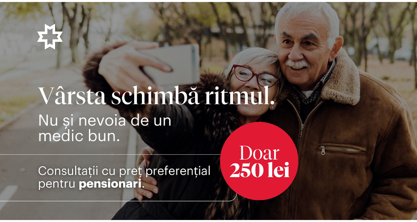 Pentru a facilita accesul seniorilor la servicii medicale private, Regina Maria introduce un nou serviciu dedicat pensionarilor: consultații medicale la tarif preferențial, de doar 250 lei. Disponibil pentru un număr mare de specialități incluse în program, acest serviciu oferă o alternativă accesibilă pentru evaluări realizate la timp, fără presiunea costurilor ridicate. Soluția este una simplă și transparentă, fără pachete sau abonamente, și poate fi accesată în clinicile Regina Maria din București, Constanța și Brașov.