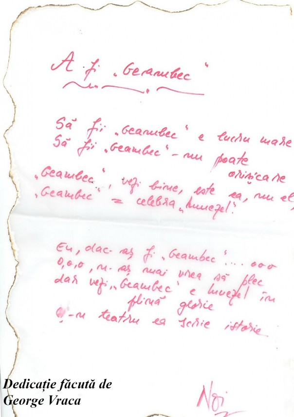 Şi îmi mai amintesc că, prin anii 80, a existat o perioadă de cinci ani când ni s-a impus autofinanţare şi se ajunsese să se joace şi câte trei-patru spectacole pe zi. Aici două la sală şi alte două în judeţ. Dar cinci ani s-a luat 100% salariul tot colectivul. Iar domnul Romeo Profit, care era secretarul literar al teatrelor, îmi spunea: «Nu ştiu... dacă nu ai fi tu, Muezica, ce ne-am face!» Am născut în teatru, mi s-a rupt apa acolo, pe holurile teatrului... Am făcut infarct în teatru, am stat trei zile la reanimare, iar după o zi şi-o noapte în salon m-am îmbrăcat şi am plecat la teatru“, îşi încheie povestea Muezel Geambec, unul dintre cei mai dedicaţi seniori ai scenei teatrului constănţean.